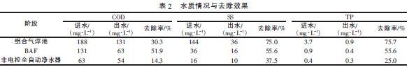 该工程自调试成功以来,运行状况良好,系统出水各项指标均能达到《污水综合排放标准》(GB8978-1996)中一级排放标准要求。具体水质情况及去除效果见表2。