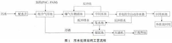 处理过程中产生的污泥主要包括斜管沉淀池污泥和浅层气浮剩余污泥。污泥泵入污泥浓缩池进行浓缩,浓缩污泥脱水后外运处理。脱水机房产生的污泥过滤液和反冲洗水收集于脱水机底部集水槽中,可以通过管路连接自流入集水池,重新处理。
