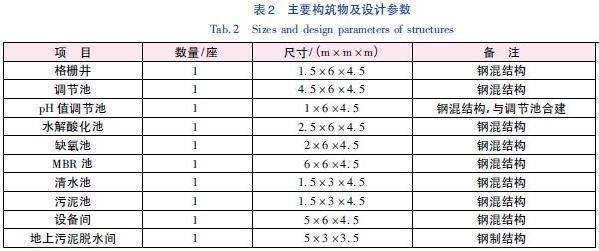 废水先通过机械格栅除去较大的固体悬浮物。从格栅井流出废水泵入调节池,以均匀水质,缓解水力冲击负荷对后续工艺的影响。调节池出水进入水解酸化池,水解酸化池出水依次进入缺氧池和MBR 池,缺氧池的主要作用是进行反硝化脱氮,从而去除废水中的氨氮。MBR 集膜的高效分离和生物降解于一体,是将污水生物处理技术与膜分离技术相结合的新型污水处理工艺。其用膜组件代替了传统活性污泥工艺中的二沉池,可进行高效固液分离,达到水净化的目的,克服了传统工艺中出水水质欠稳定、污泥易膨胀等不足。生物反应器内保持较高的污泥浓度,硝化能力强,污染物去除率高,部分混合液回流至缺氧池进行反硝化去除氨氮。MBR 池出水进入到清水池进行消毒后,出水可回用或达标排放。主要构筑物尺寸及设计参数见表2。