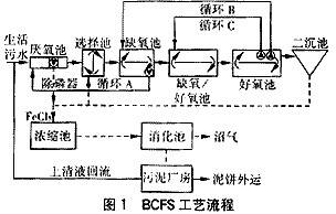 BCFS工艺是由荷兰Delft大学的Mark教授在氧化沟和UCT工艺基础上开发的,是目前已经投入使用的单污泥系统。工艺由厌氧池、选择池、缺氧池、混合池及好氧池等5个功能相对专一的反应器组成。通过反应器之间的3个循环,来优化各反应器内细菌的生存环境,充分利用反硝化除磷菌的反硝化除磷和脱氮双重作用,来实现磷的完全去除和氮的最佳去除过程。BCFS工艺突出了反硝化除磷在系统中的作用,将反硝化脱氮与生物除磷有机地合二为一,其主要特点是:对氮、磷的去除率高;SVI值低(80~120ml/g)且稳定;控制简单,通过氧化还原电位与溶解氧可有效地实现过程稳定;与常规污水厂相比,其污泥量减少10%;利用反硝化聚磷菌(DPB)实现生物除磷,使碳源(COD)能被有效地利用,使该工艺在COD/(N+P)值相对低的情况下仍能保持良好的运行状态;可回收磷。因此该工艺是一种可持续的污水处理技术。BCFS工艺由5个功能相对专一的独立反应器(厌氧池、选择池、缺氧池、缺氧/好氧池、好氧池)及3路循环系统构成,各循环的作用如下图所示: