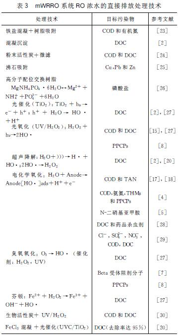 ²»Í¬ÓÚ³ÇÊÐÉú»îÎÛË®£¬mWRROϵͳROŨˮµÄBOD5/COD Öµ¼«µÍ¡¢¾ßÓнϸߵÄTDS¡¢NO3-¡¢PO43-ºÍ¼î¶È£¨¼û±í1£©£¬Ê¹µÃROŨˮµÄ´¦Àí²»Í¬ÇÒÄÑÓÚ³ÇÊÐÉú»îÎÛË®¡£Ä¿Ç°£¬Ñо¿±¨µÀµÄ´¦Àí·½·¨Ö÷ÒªÓÐÎü¸½·¨¡¢µçÉøÎö¡¢ÐõÄý·¨¡¢¸ß¼¶Ñõ»¯ÒÔ¼°×éºÏ¼¼ÊõµÈ£¬»ù±¾¶¼´¦ÓÚʵÑéÊÒСÊÔÑо¿½×¶Î£¬´¦ÀíÄ¿±êÖ÷ÒªÕë¶ÔROŨˮÖеÄCODºÍDOC¿ªÕ¹£¬Ò²ÓÐһЩÎÄÏ×±¨µÀÁ˶ÔROŨˮÖеª¡¢Áס¢ÖؽðÊôºÍ΢Á¿ÓлúÎïµÈµÄÑо¿£¬Èç±í3Ëùʾ¡£