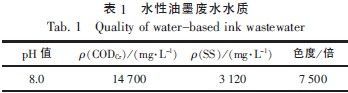 试验用水来源于西安市某水性油墨生产企业,该废水呈紫红色,不透明,有强烈的碱臭,主要污染物是亲水性颜料、丙烯酸树脂以及石蜡等添加剂。废水水质检测结果如表1 所示。