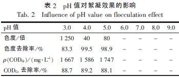 静置30 min 后发现,当pH 值≥ 6.0 时,溶液未分层,仍呈均匀紫红色,故没有对其CODCr浓度和色度进行测定。当pH 值≤ 5.0 时,溶液出现明显的分层现象,并且上清液中看不到悬浮物。试验结果表明,pH 值为4.0 和5.0 时的色度去除率较pH 值为3.0 时高,这可能与酸度过低导致水性油墨的稳定性增强有关[14]。pH 值为3.0 ~ 5.0 时,其变化对水性油墨废水的CODCr去除率影响不大。表2 中的数据表明,pH 值为4.0 时,色度和CODCr的去除效果最好,去除率分别可以达到99.5% 和89.2%。因此,絮凝效果以pH 值为4.0 时最佳。