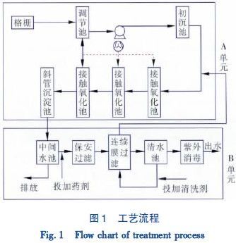 为保证工艺对水质、水量的变化有较强的抗冲击能力,同时为避免工程运行过程中可能出现的生化阶段故障使膜过滤单元受到影响,整体工程设计成A、B两个单元.A 单元为生化处理单元,主要包括调节池、三级生物接触氧化、高效沉淀池; B单元为膜过滤单元,主要包括膜过滤装置以及消毒系统等.与传统接触氧化工艺相比,生物处理部分之后增加膜过滤可以在保证出水水质的前提下缩短水力停留时间,减少运行周期,提高运行效率.