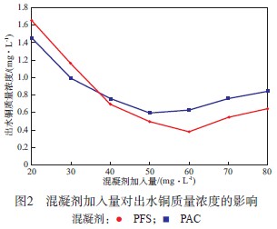 µ±³õʼ·ÏË®pHΪ9.0¡¢¹èÔåÍÁ¼ÓÈëÁ¿Îª120 mg/L¡¢¿ìËÙ½Á°èËÙÂÊΪ280 r/minʱ£¬»ìÄý¼Á¼ÓÈëÁ¿¶Ô³öË®ÍÖÊÁ¿Å¨¶ÈµÄÓ°Ïì¼ûͼ2¡£ÓÉͼ2¿É¼û£ºËæ×ÅPAC»òPFS¼ÓÈëÁ¿µÄÔö¼Ó£¬³öË®ÍÖÊÁ¿Å¨¶È¾ù³ÊÏÖÏÈ¿ìËÙ¼õСºó»ºÂýÔö¼ÓµÄÇ÷ÊÆ£»µ±»ìÄý¼ÁµÄ¼ÓÈëÁ¿´óÓÚ40 mg/Lʱ£¬³öË®ÍÖÊÁ¿Å¨¶È¾ùµÍÓÚ1 mg/L£¬ÇÒPFSÒª±ÈPACµÄ³ýÍЧ¹ûºÃ£»µ±PAC¼ÓÈëÁ¿Îª50mg/Lʱ£¬³öË®ÍÖÊÁ¿Å¨¶È×îС£»µ±PFS¼ÓÈëÁ¿Îª60mg/Lʱ£¬³öË®ÍÖÊÁ¿Å¨¶È×îС£¬ÐõÄýЧ¹û×î¼Ñ¡£ÕâÖ÷ÒªÊÇÒòÎªËæ×żÓÈëÁ¿µÄÔö¼Ó£¬PACºÍPFSË®½â²úÉúµÄËá¶ÈʹÈÜÒºpH½µµÍ£¬³¬³öÁË»ìÄýµÄ×î¼ÑpH·¶Î§¡£Òò´ËPACµÄ¼ÓÈëÁ¿ÒË¿ØÖÆÔÚ50 mg/L£¬PFSµÄ¼ÓÈëÁ¿ÒË¿ØÖÆÔÚ60 mg/L¡£