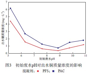 pH²»½öÓ°ÏìÍÔÚË®ÖеÄÐÎ̬·Ö²¼£¬¶øÇÒÓ°Ï츴Åä¼ÁµÄÎü¸½Ð§¹ûºÍÇ¿»¯»ìÄýЧ¹û¡£ÒòΪPAC»òPFSͶÈëË®Öкó£¬Ë®½â¹ý³ÌÖв»¶Ï²úÉúH+£¬Ìá¸ßÁËË®µÄËá¶È£¬ÒÔÖÁʹpHϽµµ½×î¼Ñ»ìÄýÌõ¼þÒÔÏ¡£Òò´ËÈÜÒºÖбØÐëÒªÓÐÒ»¶¨µÄ¼î¶È¡£µ±PACºÍPFSµÄ¼ÓÈëÁ¿·Ö±ðΪ50 mg/LºÍ60 mg/L¡¢¹èÔåÍÁ¼ÓÈëÁ¿Îª120 mg/L¡¢¿ìËÙ½Á°èËÙÂÊΪ280 r/minʱ£¬³õʼ·ÏË®pH¶Ô³öË®ÍÖÊÁ¿Å¨¶ÈµÄÓ°Ïì¼ûͼ3¡£ÓÉͼ3¿É¼û£ºËæ×ųõʼ·ÏË®pHµÄ±ä»¯£¬Í¶¼ÓPACÓëPFS¶Ô³öË®ÍÖÊÁ¿Å¨¶ÈµÄÓ°Ïì±ä»¯Ç÷ÊÆÏàËÆ£¬ÇÒͶ¼ÓPFSʱµÄ³öË®ÍÖÊÁ¿Å¨¶ÈСÓÚͶ¼ÓPAC£¬¶ÔÍÈ¥³ýЧ¹û¸üºÃ£»µ±³õʼ·ÏË®pHΪ5.0¡«8.0ʱ£¬Ëæ³õʼ·ÏË®pHÔö´ó£¬³öË®ÍÖÊÁ¿Å¨¶ÈÃ÷ÏÔ¼õС£»µ±³õʼ·ÏË®pHΪ9.0¡«11.0ʱ£¬Ëæ³õʼ·ÏË®pHÔö´ó£¬³öË®ÍÖÊÁ¿Å¨¶ÈÔö¼ÓÇ÷»º£»µ±³õʼ·ÏË®pHΪ8.0¡«9.0ʱ£¬³öË®ÍÖÊÁ¿Å¨¶È×îС£¬ÍµÄÈ¥³ýÂÊÎȶ¨ÔÚ99.0%ÒÔÉÏ¡£ÕâÖ÷ÒªÊÇÓÉÓÚpH½ÏµÍ»ò½Ï¸ßʱ£¬²»ÀûÓÚPACºÍPFSµÄË®½â²úÎïÇâÑõ»¯ÂÁ¼°ÇâÑõ»¯ÌúµÄÉú³É£¬Ó°Ïì»ìÄýЧ¹û£»ÇÒµ±pHÆ«¸ßʱ£¬PACË®½âÒײúÉúÆ«ÂÁËá¸ù£¬Ó°ÏìPACµÄ»ìÄýЧ¹û¡£ÊµÑéÑ¡Ôñ³õʼ·ÏË®pHΪ9.0¡£