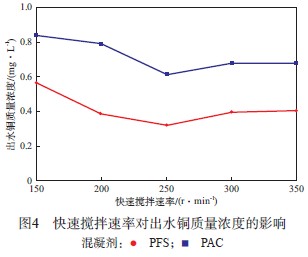 »ìÄý¼ÁͶÈëË®Öк󣬱ØÐë´´ÔìÊÊÒ˵ÄË®Á¦Ìõ¼þʹ»ìÄý×÷ÓÃ˳Àû½øÐУ¬ÌرðÊÇÔÚ»ìºÏ½×¶Î£¬ÒªÇó¶ÔË®Ñù½øÐÐÇ¿ÁÒ½Á°è£¬Ê¹»ìÄý¼ÁѸËÙ¡¢¾ùÔȵØÓëË®Ñù½øÐÐË®½âºÍËõ¾Û·´Ó¦£¬Òò´ËÒ»¶¨µÄ¿ìËÙ½Á°èÊǺÜÓбØÒªµÄ¡£µ±PACºÍPFSµÄ¼ÓÈëÁ¿·Ö±ðΪ50 mg/LºÍ60 mg/L¡¢³õʼ·ÏË®pHΪ9.0¡¢¹èÔåÍÁ¼ÓÈëÁ¿Îª120mg/Lʱ£¬¿ìËÙ½Á°èËÙÂʶԳöË®ÍÖÊÁ¿Å¨¶ÈµÄÓ°Ïì¼ûͼ4¡£