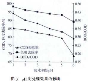 ÓÉͼ3 ¿É¼û£¬ÓÉÓÚ½ÏÇ¿µÄËáÐÔÌõ¼þÓÐÀûÓÚ΢µç½âµç»¯Ñ§·´Ó¦µÄ½øÐУ¬Ëæ×ÅpH µÄ²»¶ÏÔö¼Ó£¬·ÏË®COD¡¢É«¶ÈµÄÈ¥³ýÂÊÒÔ¼°B/C ²»¶ÏµØ½µµÍ¡£µ«ÊÇpH¹ýµÍ²»½ö»áÔö¼ÓËáµÄ³É±¾£¬¶øÇÒ»áʹÌúмÏûºÄÁ¿´ó£¬ÏàÓ¦Ìúм³É±¾Ò²Ôö´ó£¬Ë®ÖÐÈܽâÐÔÌúº¬Á¿Ôö´ó£¬ÎÛÄàÁ¿Ôö¶à¡£ÔÚpH¡Ü2 µÄ·¶Î§ÄÚ£¬´¦ÀíЧ¹ûϽµ²»Ã÷ÏÔ£¬Òò´ËÈ·¶¨Fe/C ΢µç½â×î¼ÑµÄ³õʼpH Ϊ2¡£