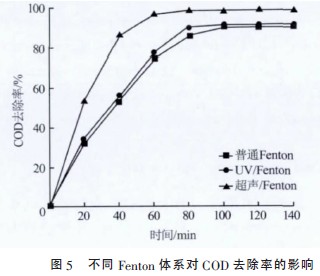 Ŀǰ£¬²»ÉÙÑо¿¹¤×÷Õß°Ñ×ÏÍâ¹â¡¢Î¢²¨¡¢³¬ÉùµÈÒýÈëµ½Fenton ·´Ó¦ÌåϵÖУ¬¼«´óµØÌá¸ßÁËFenton Ñõ»¯µÄ´¦ÀíЧ¹û¡£ÔÚFenton¡¢UV/Fenton¡¢³¬Éù/FentonÕâ3 ÖÖÌåϵÏ£¬¿ØÖÆÌõ¼þ£ºpH Ϊ3¡¢H2O2µÄͶ¼ÓÁ¿Îª8 mL£¬·Ö±ðÔÚ²»Í¬Ê±¼äÈ¡Ñù£¬¿¼²ì·´Ó¦Ê±¼ä¶Ô3 ÖÖÌåϵÏÂCOD È¥³ýÂʵÄÓ°Ï죬½á¹ûÈçͼ5 Ëùʾ¡£