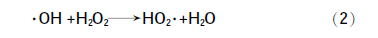 由图 2可知,随着FeSO4·7H2O投加量的增加,COD、NH3-N和色度去除率升高,当FeSO4·7H2O投加量增加至500 mg/L时,处理效果达到最佳,继续增加FeSO4·7H2O投加量,COD、NH3-N和色度去除率则有所下降。这是因为当FeSO4·7H2O投加量较低时,溶液中Fe2+催化H2O2产生·OH的速度慢、产量少,因此氧化效果差;而当FeSO4·7H2O投加量过大时,过量的Fe2+会与·OH发生如式(1)的氧化反应,从而消耗掉起主要作用的有效因子·OH,导致COD、NH3-N和色度去除率下降〔11〕。选择FeSO4·7H2O投加量为500 mg/L较为适宜。