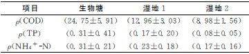 生物塘进水平均值为:ρ(COD)=(68.71±8.27)mg/L,ρ(TP)=(1.43±0.53)mg/L,ρ(NH4+-N)=(0.97±0.43)mg/L。污染浓度不是很高,但是如果直接排入黄沙河,还是会对其造成污染威胁。