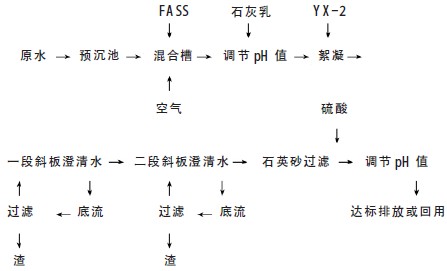 ÔÚÏÖÓÐÎÛË®´¦ÀíÉ豸µÄ»ù´¡ÉÏ£¬²ÉÓÃʯ»ÒÖкͺó£¬ÔÚÒ»¶Î·´Ó¦ÏäÖвÉÓÃÌí¼ÓµÄFASS ÎÞ»ú¸´ºÏ¾»Ë®¼ÁÓëµÄ¡°¸ßЧ¶à¹¦ÄÜYX-2 ÐÍ»ìÄý¼Á¡±Ïà½áºÏµÄ·½Ê½£¬ÔÚÎÛË®Á÷Á¿¡¢ÖؽðÊôÀïÎȶ¨¿É¿ØÇé¿öÏ£¬ÄÜÓÐЧµØ½«·ÏË®ÖеÄп²ÐÓຬÁ¿½µµÍÖÁ1.5 mg/L ÒÔÏ£¬ïÓ0.05 mg/L ÒÔÏ£¬³öˮˮÖÊÇ峹͸Ã÷£¬ÎÞÒìÉ«£¬´¦ÀíºóµÄË®¼È¿É»ØÓã¬ÇÒ²»¶ÔÉú²úÔì³ÉÓ°Ï죬Ҳ¿ÉÍêÈ«´ïµ½¹ú¼Ò»·±£²¿ÓÚ2010 Äê9Ô·¢²¼µÄ¡°Ç¦¡¢Ð¿¹¤ÒµÎÛȾÎïÅŷűê×¼¡±£¨GB 25466¡ª2010£©µÄ¹æ¶¨¡£