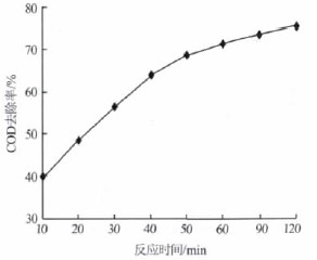 通入300 mL 印染废水,在废水pH=8.6、臭氧通气量为0.2 L/min、(Fe+Mn)/AC 投加质量为20 g的条件下,分别在反应10、20、30、40、50、60、90、120 min时取样分析并计算COD 去除率,结果见图2。