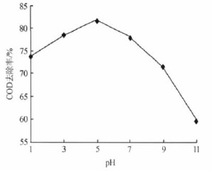由图5 可以看出,pH 在4~6 时,(Fe+Mn)/AC的催化活性较高,COD 的去除率均达到75%以上,并以pH=5 时最高。因此确定本试验废水最佳pH=5。