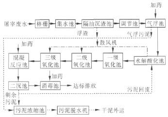 根据屠宰废水的特点,采用以水解酸化/三级生物接触氧化为主的处理工艺,具体工艺流程如图1所示。