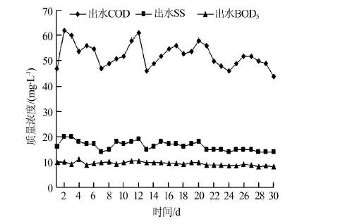 该处理系统经过3个多月的运行后,设备运转正常,整个系统一直处于稳定状态,当进水COD在 1 560~2 490 mg/L,BOD5在620~880 mg/L,SS在150~200 mg/L时,出水COD<62 mg/L,BOD5<20 mg/L,SS<11 mg/L,出水水质可达到设计要求。2012年6月该系统出水COD、BOD5、SS变化情况见图 4。