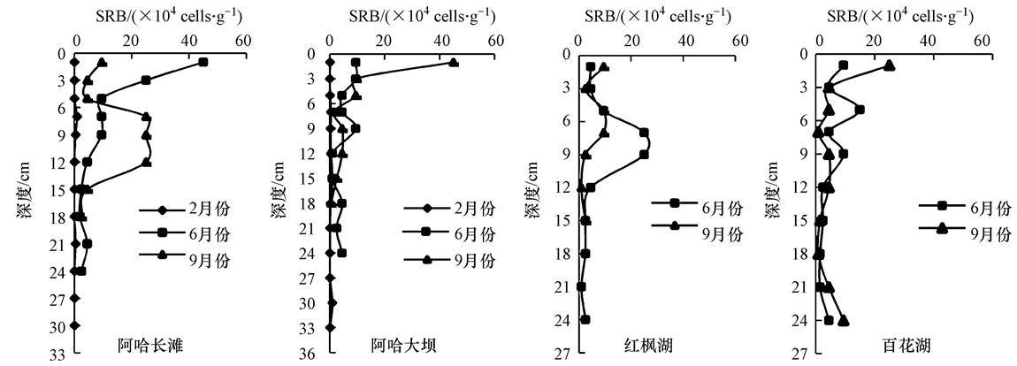 图4 贵阳市不同水库沉积物中SRB含量的季节变化特征(罗光俊等,2014)(注:0 cm为沉积物表层,深度数值越大,表明沉积物深度越大)