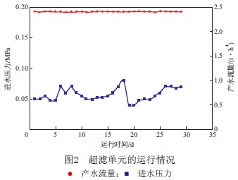 ³¬Â˵¥ÔªÔÚ²úË®Á÷Á¿ºã¶¨µÄÌõ¼þÏÂÔËÐУ¬Í¨¹ý¹Û²ì³¬Â˵¥Ôª½øË®Ñ¹Á¦µÄ±ä»¯À´±íÕ÷³¬ÂËĤµÄÎÛ¶ÂÇé¿ö£¬ÒÔ¼°ÅжÏÊÇ·ñÐèÒª¶ÔĤ½øÐл¯Ñ§ÇåÏ´¡£Í¨¹ýÌõ¼þÊÔÑéÈ·¶¨Á˳¬Â˵¥ÔªÎȶ¨ÔËÐеŤÒÕÌõ¼þΪˮÎÂ25 ¡æ¡¢Ä¤Í¨Á¿ 60 L/£¨m2¡¤h£©¡¢·´³åÏ´30min¡£ÔÚÉÏÊöÎȶ¨ÔËÐеŤÒÕÌõ¼þÏ£¬³¬Â˵¥ÔªµÄÔËÐÐÇé¿ö¼ûͼ2¡£ÓÉͼ2¿É¼û£¬ÔÚ³¬Â˺㶨²úË®Á÷Á¿2.40 t/hµÄÌõ¼þÏ£¬³¬Â˵¥Ôª½øË®Ñ¹Á¦ÔÚ0.04¡«0.08MPa²¨¶¯£¬ÔËÐнüÒ»¸öÔÂÈÔÎÞÐè¶ÔĤ½øÐл¯Ñ§ÇåÏ´£¬¿ÉÒÔÈÏΪ³¬Â˵¥ÔªÔÚ¸ÃÊÔÑéÌõ¼þÏÂÔËÐÐÎȶ¨£¬ÇÒ»¯Ñ§ÇåÏ´ÖÜÆÚ¿É³¬¹ýÒ»¸öÔ¡£