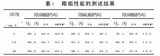 测试条件为Ca2+(以CaCO3计)250mg.L-1、PO3-45.0mg.L-1,pH=9.0测试温度:80℃,时间10h。结果见表1。