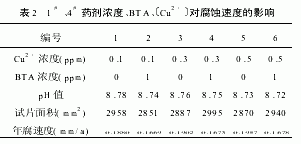 4.3 在Ca2+的存在下,一般会产生微电池腐蚀现象(或电偶腐蚀),呈点蚀形式,而计算腐蚀速度是以均匀腐蚀为前提的。由于Cu2+存在,BTA的负离子与亚铜离子形成一种不溶性的极稳定的络合物,这种络合物吸附在金属表面上,形成一层稳定的,惰性的保护膜,从而金属得到了保护。
