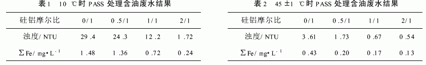 在室温(10℃)和45±1℃条件下,用硅铝摩尔比不同的PASS对废水进行处理,PASS的投加量为2mg/L(以铝计,下同),结果见表1和表2.