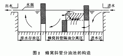 蜂窝斜管分油法是将除油池在同一过水断面上分成若干小格,这样便减少了除油池的水力半径,降低了水流雷诺数,提高了水流弗劳德数,因而可提高油水的分离效率。格子越小则其分离效果越好,但格子太小易产生阻管现象,所以常用边长为30、50、80mm的正六边形等规格斜管。蜂窝斜管分油池的构造见图2。