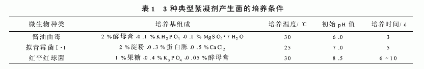 1976年,J.Nakamura等从霉菌、细菌、放线菌、酵母菌等菌种中筛选出19种具有絮凝能力的微生物,其中以酱油曲霉AJ7002产生的絮凝剂效果最好。1985年,H.Takagi等研究了拟青霉属微生物产生的絮凝剂PF101,它对枯草杆菌、大肠杆菌、啤酒酵母、血红细胞、活性污泥、纤维素粉、活性炭、硅藻土、氧化铝等有良好的絮凝效果。1986年,R.Kurane等利用红平红球菌研制出微生物絮凝剂NOC-1,它对大肠杆菌、酵母、泥浆水、河水、粉煤灰水、活性炭粉水、膨胀污泥、纸浆废水等均有极好的絮凝和脱色效果,被认为是当时发现的最好的微生物絮凝剂。美国也研制出一些高絮凝性菌株,能与其他微生物一起制成生物活性液,用以快速消除下水道淤塞、水体富营养化和污泥膨胀等。至今发现的具有絮凝性的微生物种类有霉菌、细菌、放线菌和酵母菌。由它们生产的微生物絮凝剂类型很多,其中最具代表性的3种见表1。