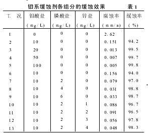 2 钼酸盐与膦酸盐以及锌盐有协同作用。通过膦酸盐和锌盐的复配,不仅降低了钼酸盐的用量而且还提高了缓蚀效果。