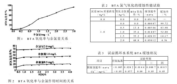 (1)循环水中加氯会破坏BTA的结构,导致BTA缓蚀性能下降。