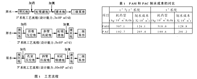 通过对聚硅酸铝絮凝剂(PASI)和固体PAC(巩义市某厂生产)的实验室及在该厂的生产性对比试验可知,PASI的有效成分Al2O3高于PAC,且PASI的絮凝速度快,矾花密度大,基本上消除了斜管沉淀池“跑矾"的情况。使用PASI后的各项出水水质均优于PAC,尤其是残余铝的含量明显降低。PASI和PAC制水成本的对比情况见表1。