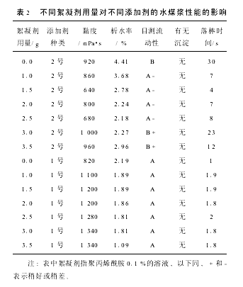 研究还表明,有些水煤浆添加剂和煤泥配合制浆,受絮凝剂的影响较小,在一定的絮凝剂浓度范围内可以使水煤浆的性能得到较大的改善,如试验中采用的2号添加剂,所以在利用煤泥制水煤浆时应考虑絮凝剂对水煤浆性能的影响,通过广泛的试验寻找一种好的煤泥制浆用添加剂,以制备性能优良的煤泥水煤浆。