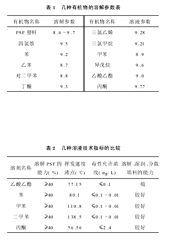 溶解力的强弱可以根据塑料与溶剂的溶解参数来确定,此差值越小,则溶解能力越强。现列出一些有机物的溶解参数如表1所示。根据表1,选择与PSF溶解参数相近的苯、甲苯、乙酸乙酯、丙酮等溶液,但考虑到其它因素,如挥发速度、毒性等因素,参考表2。根据上述所列指标,用甲苯作主溶剂,并配以适当其它助溶剂制成混合溶剂。经多次实验,证明用甲苯、乙酸乙酯、丙酮等溶剂按一定比例混合后制得混合溶剂是一种较为理想的溶剂,可以达到最佳的溶解效果。