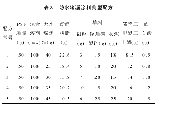 将前面制得改性PS胶置于200mL烧杯中,再在此烧杯中加入胶质量的20%~30%的无水煤焦油,放入30~40℃的恒温水浴中恒温40min以上。在恒温过程中须不断搅拌,使其充分反应,使PSF由直线型转变成网状型。然后,取出烧杯,加入增塑剂、防老剂、阻燃剂等,搅拌均匀,过滤,便制得防水堵漏涂料。