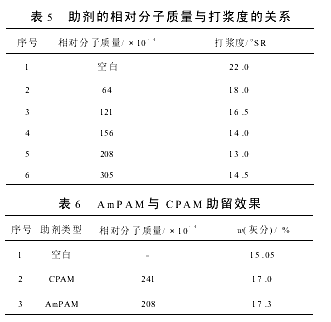 3.1.1 相对分子质量对助滤性能的影响为了考查AmPAM助滤性能,在助剂用量为w=0.15%的情况下研究了不同相对分子质量助剂的滤水性能,结果列于表5。由表5可见,在纸浆中加入AmPAM后其助滤效果特别明显,而且随着助剂相对分子质量的增大而提高,但是,相对分子质量在150万~300万范围内影响不大。