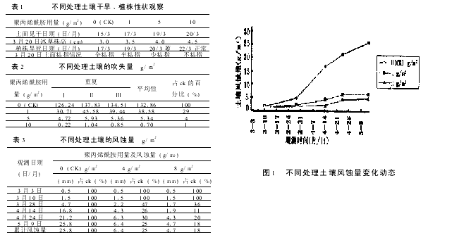 2.1 简易风洞试验结果与分析对简易风洞试验的不同处理进行了跟踪观测,土样表面面干历时随聚丙烯酰胺用量的增加而延长,种子出苗、植株性状、植株干旱历时、土壤表面粘指情况见表1。简易风洞试验中观测了各区土壤风蚀量,列于表2。可以看出,用聚丙烯酰胺处理的土样土壤风蚀量明显小于对照,并且风蚀量随聚丙烯酰胺用量的增加而减少,施用1,5,10g/m2聚丙烯酰胺的土样,土壤风蚀量平均为38.585.34和0.70g/m2,仅为对照的29%,4%和1%。施用聚丙烯酰胺可以增强土壤抗风蚀能力减少了土壤风蚀量,这对于保护土地资源、控制流沙和减少沙尘暴都会产生积极的作用。