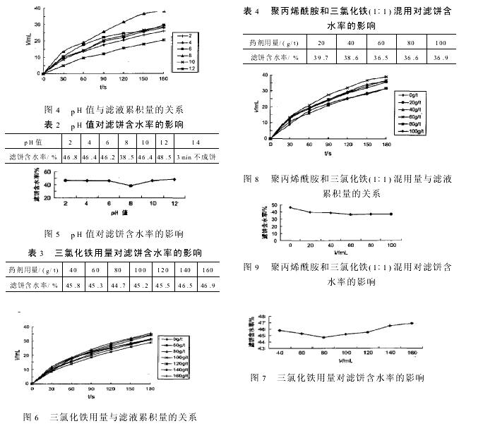 2.4 聚丙烯酰胺和三氯化铁(1∶1)混用对高岭土过滤的影响 表4和图6、图7列出了当pH为8、聚丙