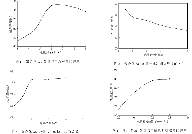 图2表明,随电解槽电压增大,产品中聚合体Alb含量增加,增加到一定程度后趋于平稳。其主要原因是当电压达到一定值以后阴极不再析铝而是析氧,并且电压升高电解溶液温度也升高,最终导致铝的水解加剧,显然不利于Alb的形成。故电解槽电压选为2V。
