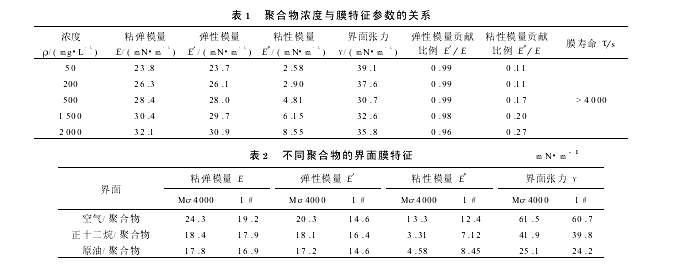 2.2 聚合物浓度对界面膜强度的影响表1给出了不同浓度的Mo 4000溶液与正十二烷的界面膜特征参数,包括平衡粘弹模量、粘性模量、弹性模量、界面张力、膜寿命以及粘性模量、弹性模量贡献比例。由实验结果可见,随着Mo 4000溶液浓度的增加,界面粘弹模量、粘性模量、弹性模量均增加。由于膜粘弹性的增强意味着膜分子间作用力增大,因此说明聚合物浓度增加,在油/水界面上,聚合物分子间的相互作用力增强。由于Mo 4000溶液属粘弹性流体,与正十二烷形成的界面膜中,以弹性成分为主,随浓度的增加,分子间力作用增强,其贡献比例略有下降,而粘性比例开始上升。从实验结果还可以看出,正十二烷/聚合物界面膜的寿命较长,原因有两个,一是聚合物溶液具有很强的粘滞力,阻碍了液膜变薄;二是体系具有较高的界面张力,液膜能稳定存在。同时可以看到,聚合物浓度对界面张力基本无影响。