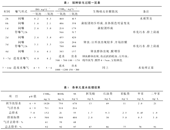控制BOD∶N∶P=100∶5∶1,驯化过程见表2。