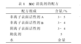 2 MCÇåÏ´¼ÁµÄÑÐÖÆ¼°ÐÔÄÜÌØµãÑÐÖÆ³£Î¸ßЧÇåÏ´¼ÁµÄ¹Ø¼üÊDZíÃæ»îÐÔ¼Á¡¢ÖúÏ´¼ÁµÄÑ¡Ôñ¼°ÆäÅä±ÈÓÅ»¯¡£±¾ÎÄͨ¹ýÕý½»ÊÔÑéºÍÖØ¸´ÐÔÊÔÑ飬ÓÅÑ¡ÁËÔÁϲ¢È·¶¨³ö×î¼ÑÅä±È£¬¼û±í1¡£
