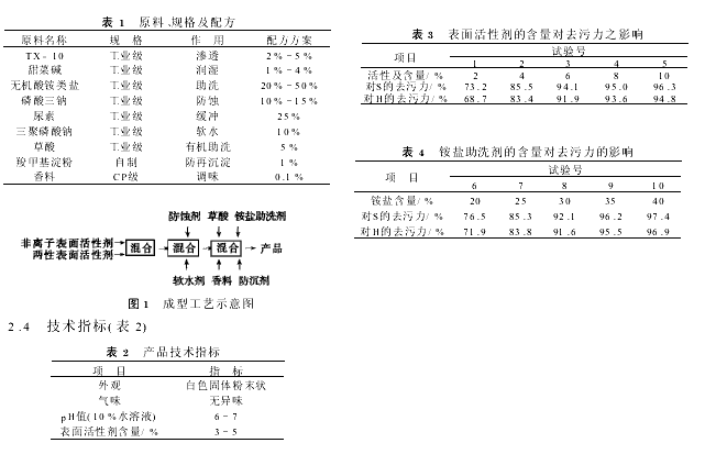3.4大面积外墙瓷砖清洗应用试验按小实验配方进行工业化试生产,用制备出的100kg产品进行了2000m2大面积应用实验。洗涤施工单位证实,本清洗剂去污力强,擦洗次数少,省工省时。经应用实验考核,对产品配方视水质及瓷砖污垢程度不同调整范围如下:复配表面活性剂3%;铵盐助洗剂25%~30%;三聚磷酸钠8%~10%;磷酸三钠10%~15%;尿素20%~25%;草酸5%;CMS1%;香精适量。