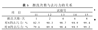 3.3擦洗次数对去污力的影响据洗涤施工公司介绍,现在化学清洗瓷砖的方法有机械擦洗和人工擦洗,以人工擦洗为目前主要的瓷砖洗涤手段,如果清洗剂配制不佳,擦洗次数多,费工费时,效益较差。擦洗次数对去污力的影响见表5,其中活性剂复配比值为1,活性剂含量=3%,铵盐含量=35%,其它含量见配方。