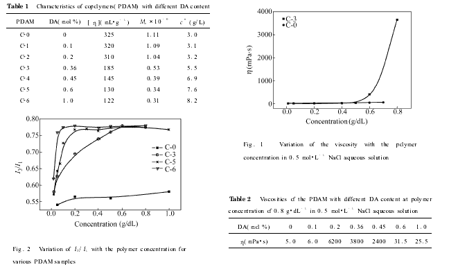 聚合反应体系中,疏水单体增溶于胶束中,而亲水单体位于连续水相,它们通过微多相体系共聚合反应获得共聚物.其疏水单体组成具有嵌段结构的特点.这大大增强疏水体的疏水性,有利于减少疏水缔合聚合物所需的疏水单体含量,从而有利于改善溶解性能.在AM和DA的共聚合反应中,采用十二烷基硫酸钠(SDS)为表面活性剂,用以在水溶液中增溶DA,在制备不同组成的样品时,单体总浓度保持一定(1 4mol.L-1),同时SDS和DA的摩尔比控制为71,引发剂采用过硫酸铵,用量为总单体质量的0 .3%.聚合反应在脱氧条件下,温度50℃反应14~20h,保持转化率90%以上,得到的聚合物分别用丙酮和甲醇重沉淀处理,产物在45℃真空干燥至恒重.按上述方法制备含有不同DA的共聚物样品C1~C6列于表1.DA含量用紫外