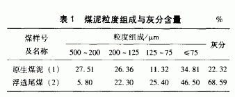 采用581一G型光电比色计、电热恒温真空干燥箱、加热磁力搅拌器、恒温水浴装置等。试验用煤泥水样分别采自望峰岗选煤厂原生煤泥和浮选尾煤,其粒度组成和灰分见表1。该煤样的特点是原生煤泥粒度大,灰分低,而浮选尾煤则粒度细,灰分高。
