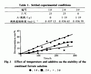 上述实验结果表明,通过在高铁酸盐溶液中加入适量助剂A或者降低其储存的环境温度,都可有效抑制复合高铁酸盐在水溶液中的分解速率,延长其储存周期,使高铁的稳定性能得到显著改善。