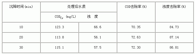 分别量取三份200mL水样于干净烧杯中,调节溶液pH值到8,再加入0.1g PAC絮凝剂,以150r/min的搅拌速度作用10min。第一个烧杯静置10min后,取上层清液,测CODCr、浊度等指标;第二个静置20min后,测各项指标;第三个静置30min后,测各项指标。以此考察沉降时间对CODCr、浊度去除率的影响。结果如表6所示。