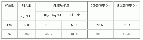 分别取两份200mL水样于干净的烧杯中,各加入0.1g PAC、AS絮凝剂,以150r/min的搅拌速度作用10min,静置沉降20min,取上层清液,测定CODCr、浊度,计算去除率。结果如表8所示。