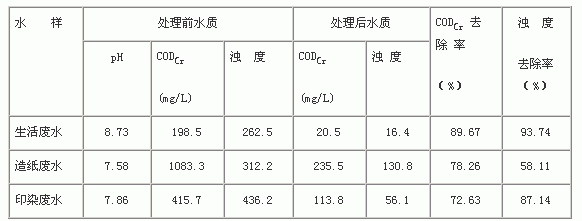 通过对比,我们可以看出,PAC对原水的处理效果较好。其中,CODCr去除率较高,都达到了70%以上;对于浊度的处理也有一定的效果,对生活污水、印染废水的去除率均达到85%以上。这可以从水样的性质中得到解释。生活污水、印染废水的CODCr、浊度主要来自于水体中有色悬浮物的贡献。当加入PAC后,对废水中的悬浮物起到了很好的絮凝、沉降、去除作用,从而使得废水的CODCr、浊度得到大幅度的降低,也就反映出较好的絮凝效果、较高的去除率。