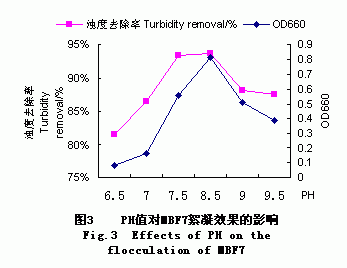 ÓÉͼ3¿ÉÖª£¬MBF7²úÉú¾ú¶ÔpHµÄÊÊÓ¦±È½ÏÇ¿£¬ÎÞÂÛÊÇÈõËáÐÔ(pH=6.5)»¹ÊÇÇ¿¼îÐÔ(pH=9.5)Ìõ¼þÏÂËù²úÉúµÄÐõÄý¼Á¶Ôµí·Û·ÏË®µÄ´¦ÀíЧ¹û¶¼´ïµ½81%ÒÔÉÏ¡£