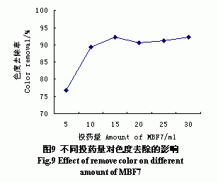 ÓÉͼ9ÖпÉÒÔ¿´³ö£¬Ëæ×Å΢ÉúÎïÐõÄý¼ÁͶ¼ÓÁ¿µÄÔö¼Ó£¬É«¶ÈµÄÈ¥³ýÂÊÒ²ÉÏÉý¡£µ«ÉÏÉýµÄËÙÂʲ»Í¬¡£µ±Í¶¼ÓÁ¿ÓÉ5mlÔö¼Óµ½10mlʱ£¬É«¶ÈÈ¥³ýЧ¹ûÔö¼ÓÃ÷ÏÔ£¬µ±Í¶¼ÓÁ¿´óÓÚ15mlÒÔºó£¬É«¶ÈÈ¥³ýЧ¹ûÔö³¤²»ÏÔÖø¡£Õâ±íÃ÷15mlµÄͶ¼ÓÁ¿ÒѾ½Ó½üÓÚӡȾ·ÏË®¿É´ïµ½µÄ×î¼Ñ״̬£¬È·¶¨×î¼ÑͶҩÁ¿Îª1L·ÏˮͶ¼Ó15ml¡£